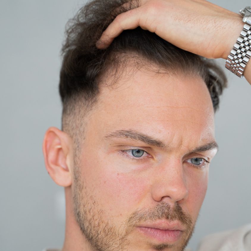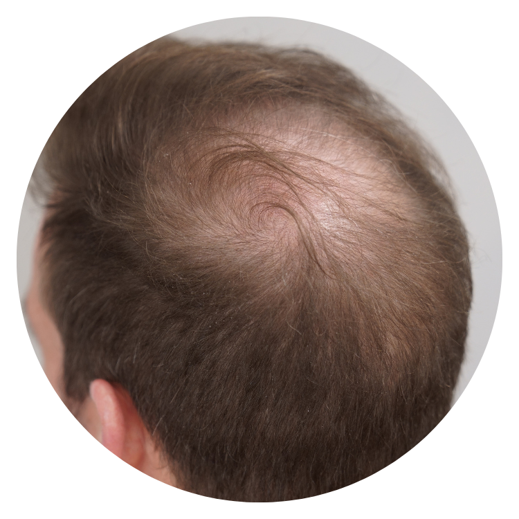 Es beginnt meist im Alter zwischen 25-35 und setzt sich dann über die Jahre fort. Dabei sind entweder spezielle Stellen betroffen, z.B. Geheimratsecken und der Hinterkopf oder der Haarausfall verteilt sich diffus über den gesamten Oberkopf. Viele Männer leiden stark unter ihrem Haarverlust, oftmals einhergehend mit Verlust von Selbstvertrauen und dem Wunsch nach einer Lösung, um volles Haar zu behalten.