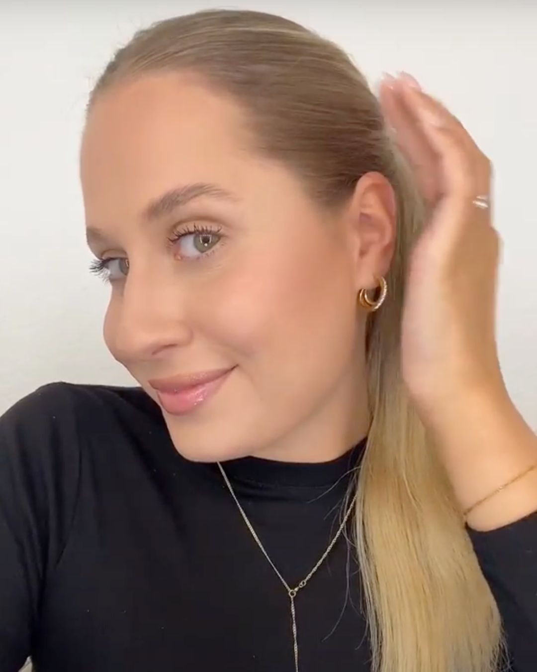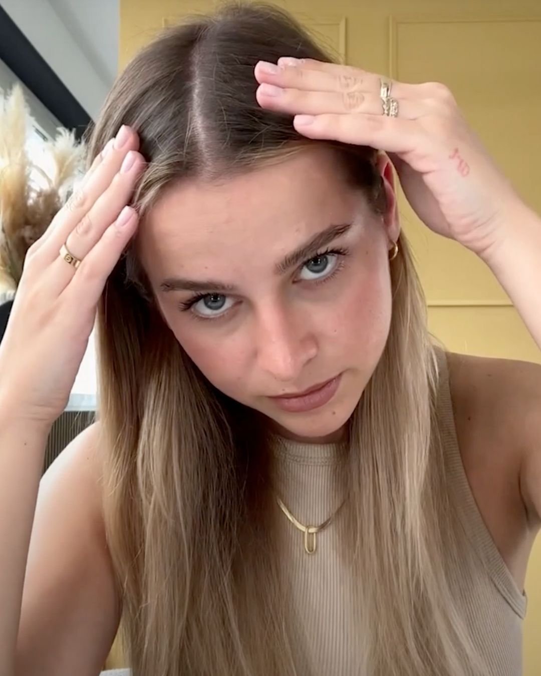 Für ihren Sleek Bun verdichtet Wicky die Haare an den Schläfen mit Ansatzpuder und Haarspray.
