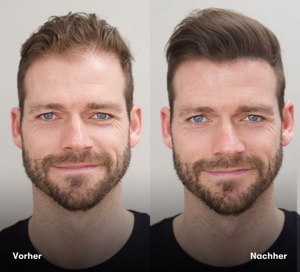 Die Veränderung ist wirklich krass. Keine Geheimratsecken mehr, Kniescheibe hinten ist weg und ich habe wieder eine stabile Frisur. Und das alles so einfach und schnell.