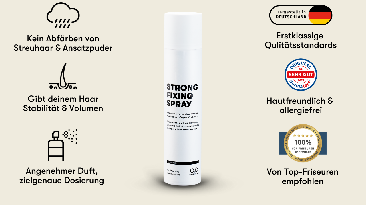 Unser Strong Fixing Spray ist ein spezielles Haarspray für den sicheren Abschluss deiner Stylingroutine. Damit fixierst du nicht nur wie gewohnt deine Frisur, sondern bei entsprechender Nutzung auch unser Streuhaar zur optimalen Haarverdichtung. Die spezielle Wirkformel umschließt und versiegelt die Baumwollfasern vom Streuhaar und Ansatzpuder mit einer vollumfänglichen Schutzschicht. So stellst du sicher, dass auch beim Sport oder auf deinem Kopfkissen keine Farbrückstände entstehen.