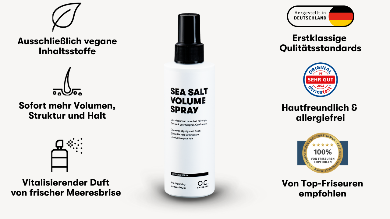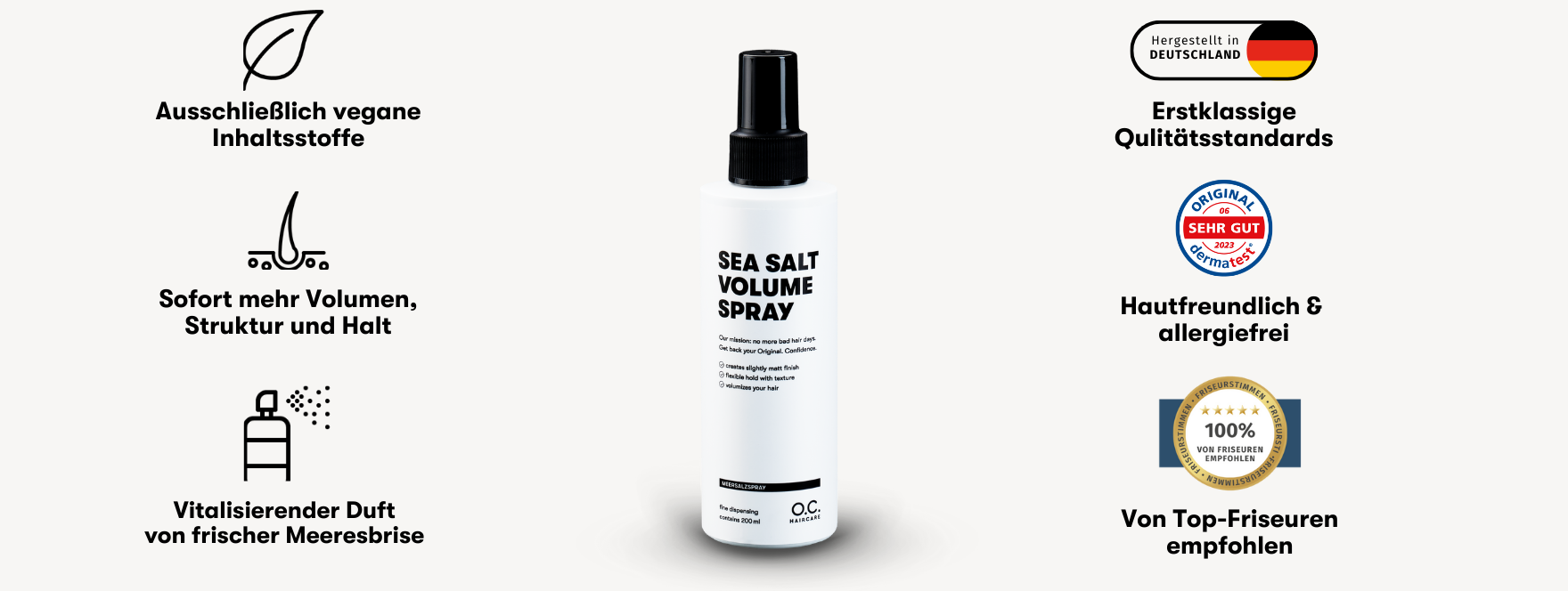 Das SEA SALT VOLUME SPRAY ist dein Add-On für noch mehr Volumen und Struktur im Haar. Eignet sich für alle Frisuren ab ca. 3cm Länge. Das Meersalzspray wird ins handtuchtrockene Haar gesprüht. Mit dem anschließenden Föhnen entsteht bereits das gewünschte Volumen und deine Haare sind deutlich voluminöser und stabiler. Eine optimale Grundlage für deinen Style.