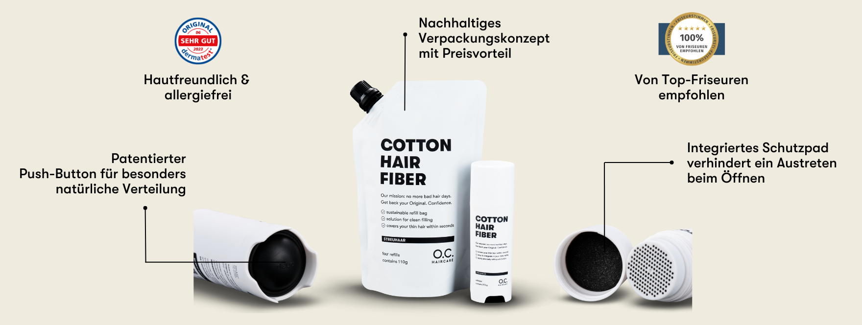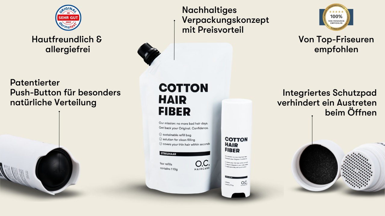 Mit unserem Streuhaar, im englischen Cotton Hair Fibers, kaschierst du kahle Stellen am Oberkopf effizient und schnell. Die 11 O.C. Farbmischungen sind für europäische Haarfarben optimiert und fügen sich harmonisch in dein Eigenhaar ein. Dank der statischen Aufladung unserer eigenen Haare haften sich die Baumwollfasern vom Streuhaar optimal in der bestehenden Struktur fest. So lassen sich nicht nur kleine, sondern auch beeindruckend große, kahle Stellen am Ober- oder Hinterkopf perfekt verdichten.